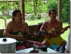Dimanche 12 juin 2011Dimanche de Pentecôte oblige, le village au grand complet se retrouve à l’église. Tenue de fête, fleurs dans les cheveux pour ces dames et chemises à fleurs pour les messieurs. Chaussures pour tout le monde, c’est dimanche. A 8h, nous y sommes aussi, pomponnés de frais. Ce n’est pas une messe, pas de curé, mais un diacre (enfin, je pense que c’est ainsi qu’on l’appelle) mène la danse, euh, la cérémonie. Il s’agit d’une succession d’interventions au micro, de chants accompagnés de guitares et ukulélés, le tout en pur Marquisien. Nous n’y comprenons rien, mais il se dégage une telle ferveur, joyeuse, festive que l’émotion est prenante. Et nous somme pris. Les voix superbes, les chants repris par tous avec force font leur œuvre: la mécréante est émue et le Protestant va communier. On aura tout vu aux Marquises…