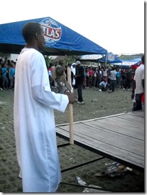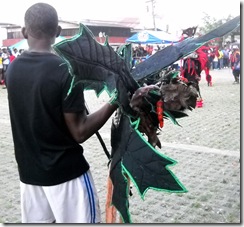 Voilà une vraie teigne: le Diablo Sucio par excellence. Que l’on pourrait traduire par “Sale Diable”… ou par Sale Bête! Celui-ci, qui n’est pas de Portobelo, n’avait rien de bon enfant. Parfois, les organisateurs –enfin, si on peut dire: les Anges, ou les chauffeurs de bus!- ont été obligés certaines années d’intervenir pour calmer des Diables qui réglaient des comptes à tour de bras. Et s’en prenaient aussi aux touristes, ce qui est une très mauvaise idée! Cette année, pas trop de mal. A part ce jeune Diable de mauvais poil qui en sautant de l’estrade a fouetté les Anges Baptistes d’un air rageur –ça ne se fait pas- et qui s’attaquait aux spectateurs bien sages sur le bord. Une dame voisine de Luké a eu le pied lacéré.